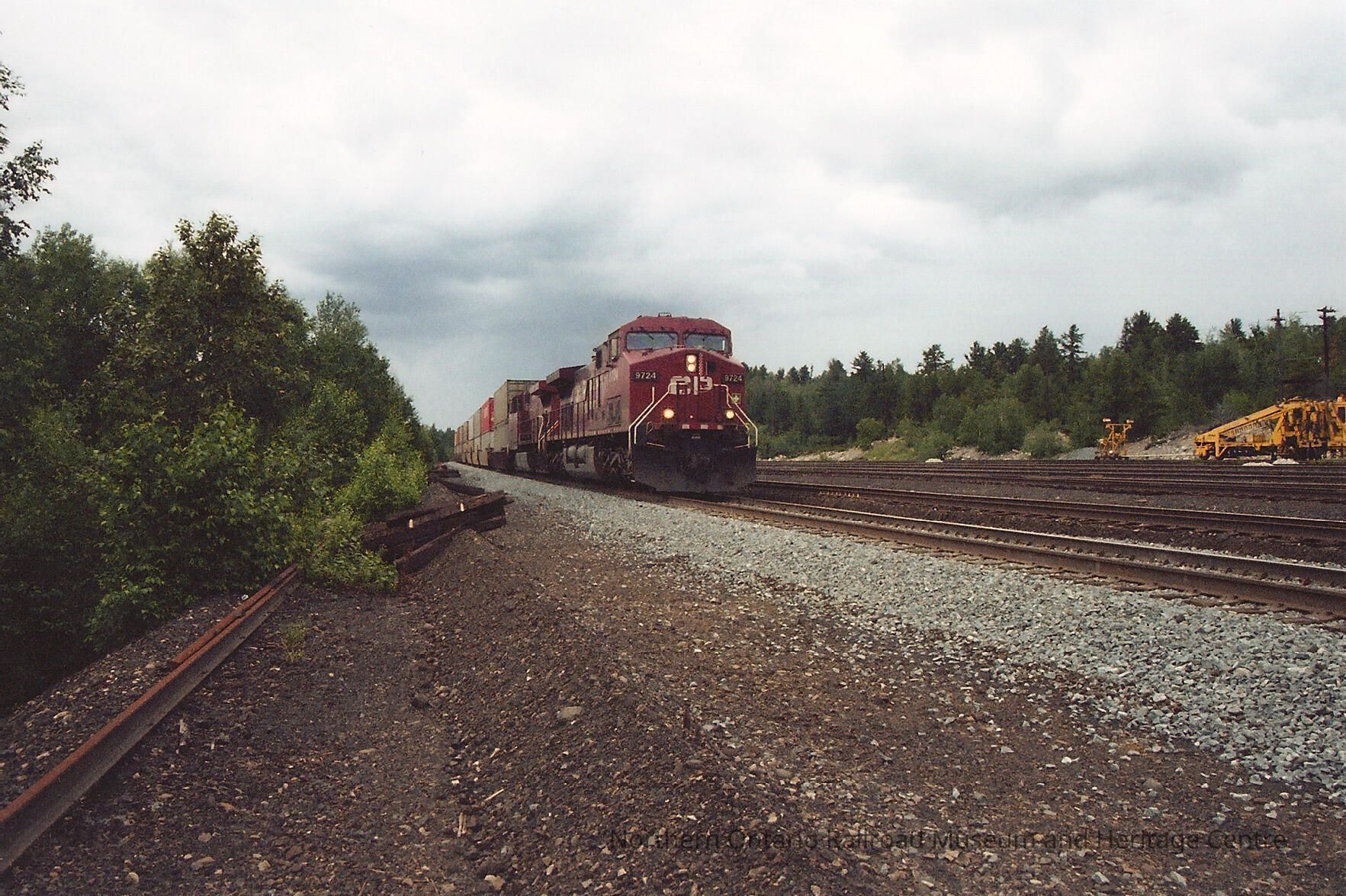 Colour photograph of CP Rail train coming up the track. Locomotive no. 9724.Collection