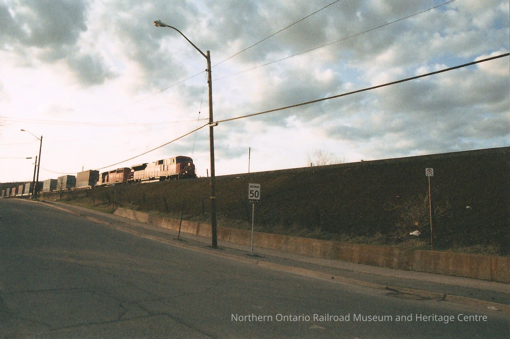 Colour photograph of CP Rail train. Photograph taken from below, on the street. 50 km/h speed limit sign is visible near the center of the image, on the side of the street.Collection