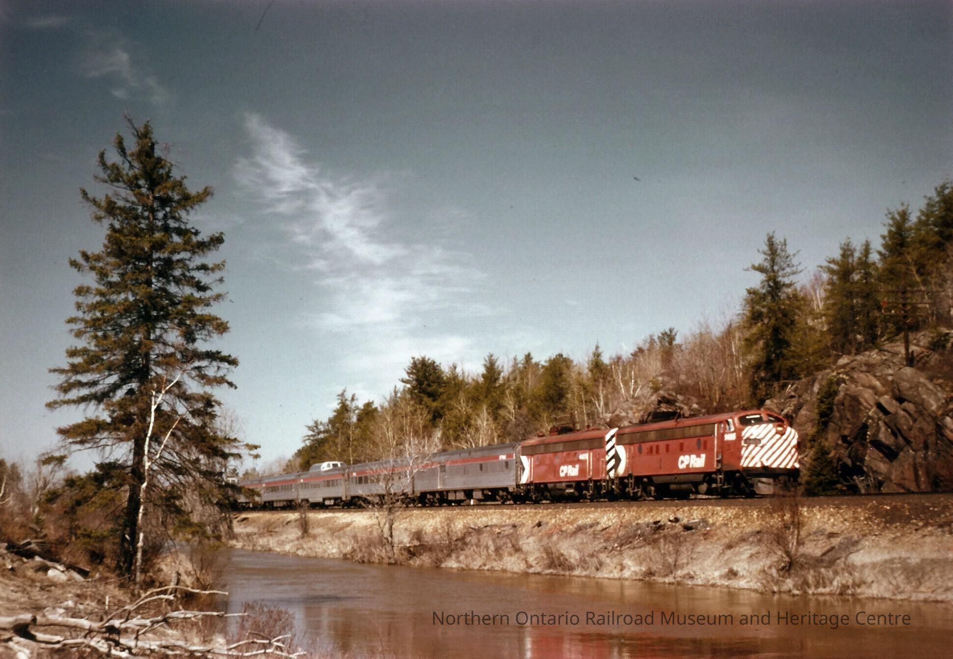 Color photograph of CP Rail train, locomotive no. 1405. Photograph taken from across a creek or river.