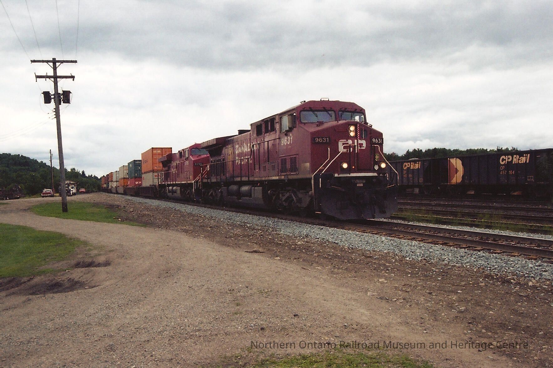 Colour photograph of CP Rail train pulling into a railroad yard (?). Locomotive no. 9631. CP Rail cars at right of image.Collection