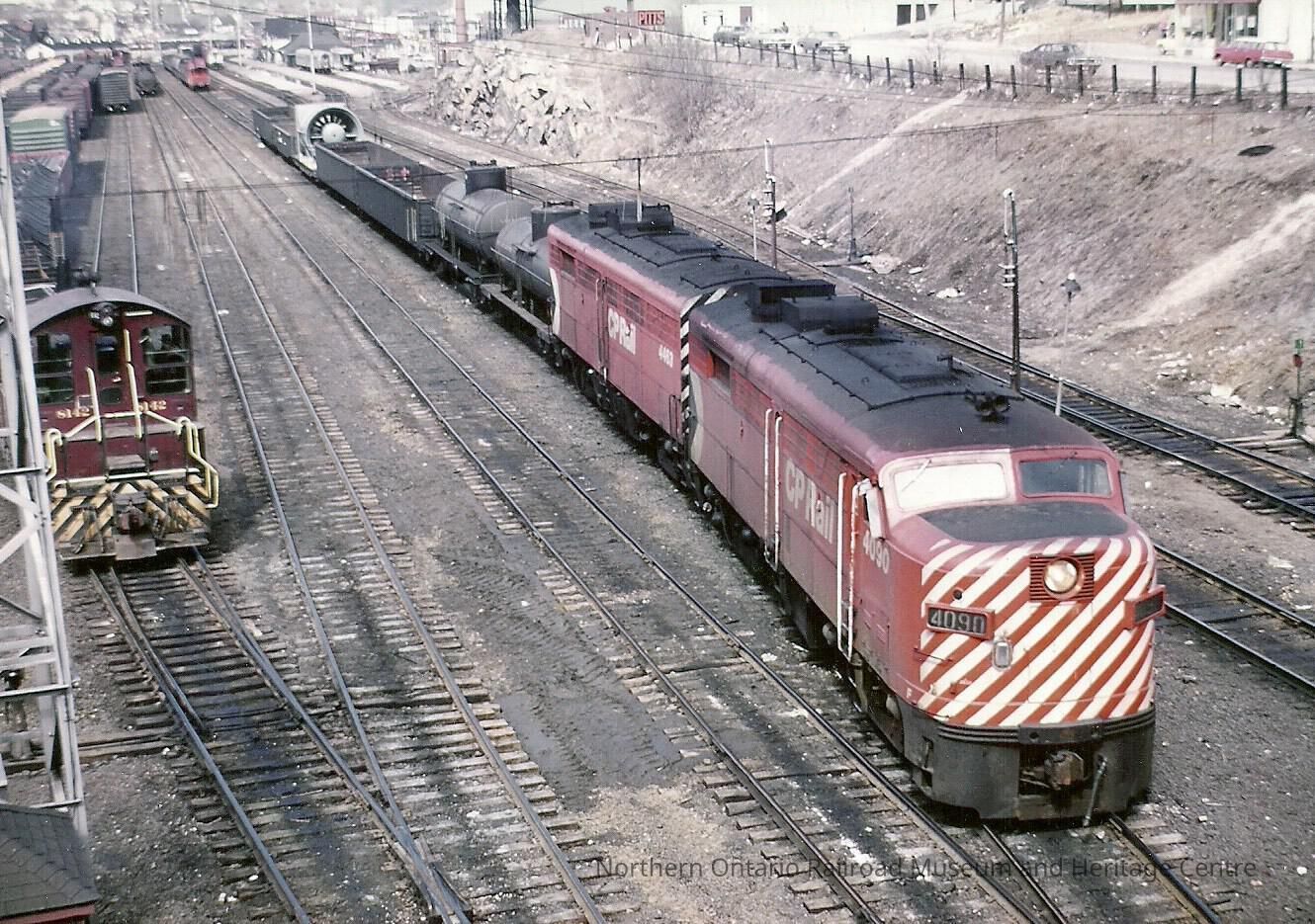 Color photograph of CP Rail train with locomotive no. 4090 in railroad yard.Context