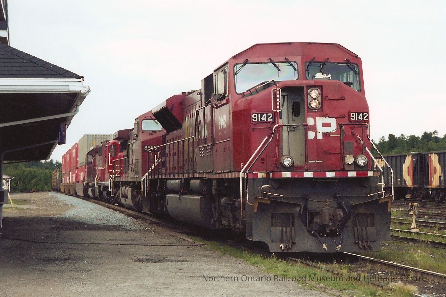 Colour photograph of a Canadian Pacific train, locomotive no. 9142, at a train station, likely Cartier.Collection