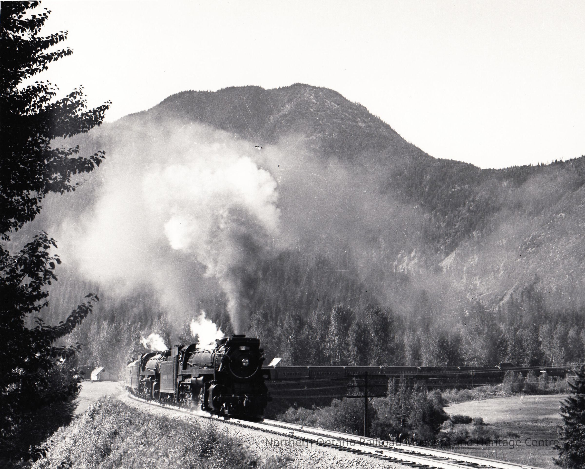 Black and White- A CPR Doubleheader pulls a passenger train through Alberta Canyon, British Columbia. In the background is a mountain. A duplicate of the other photograph.