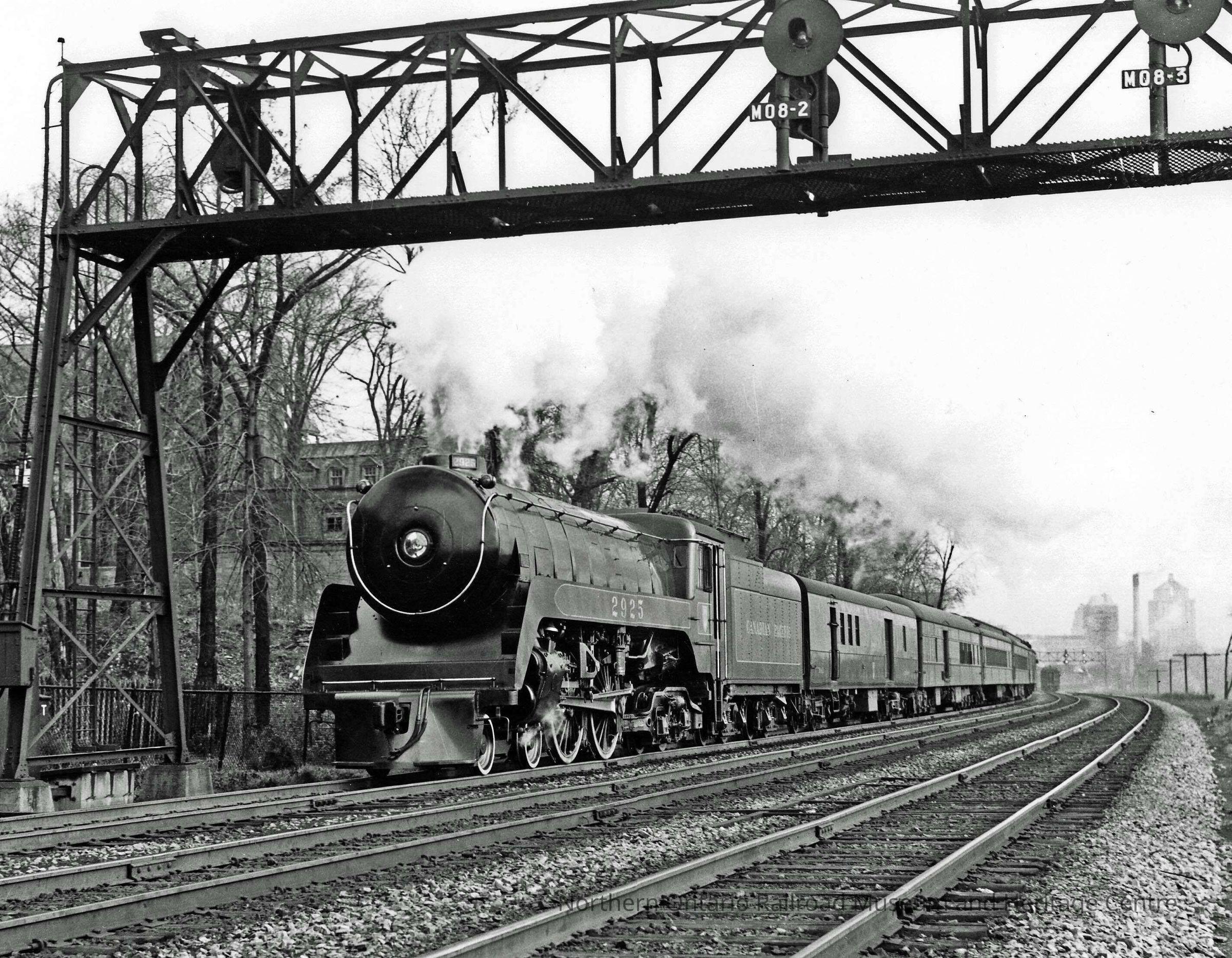 Black and White- Canadian Pacific Engine no. 2925, hauling passenger trains, passes under a metal arch.Collection