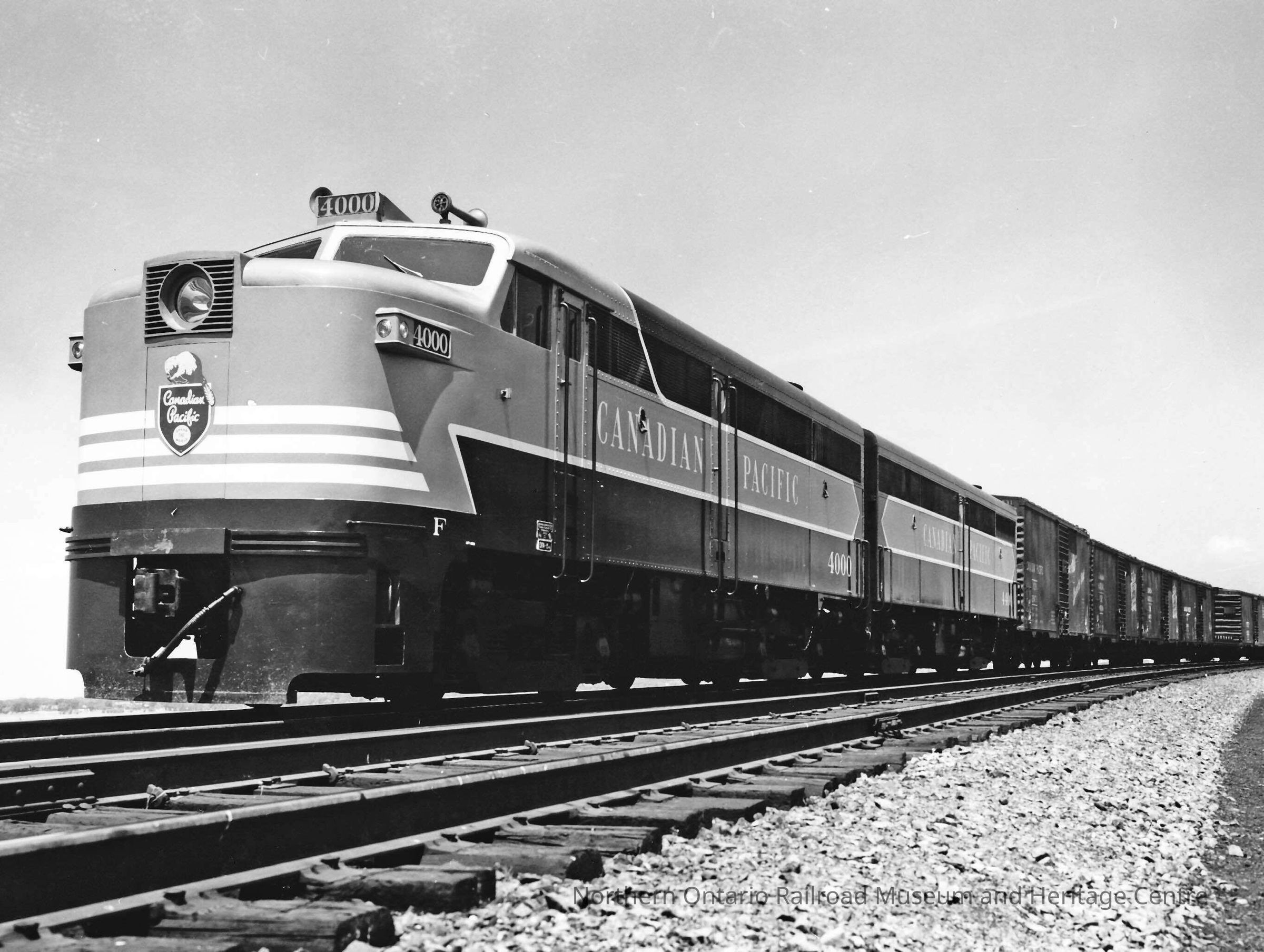 Black and White- Canadian Pacific Engine no. 4000, hauling box cars.Collection