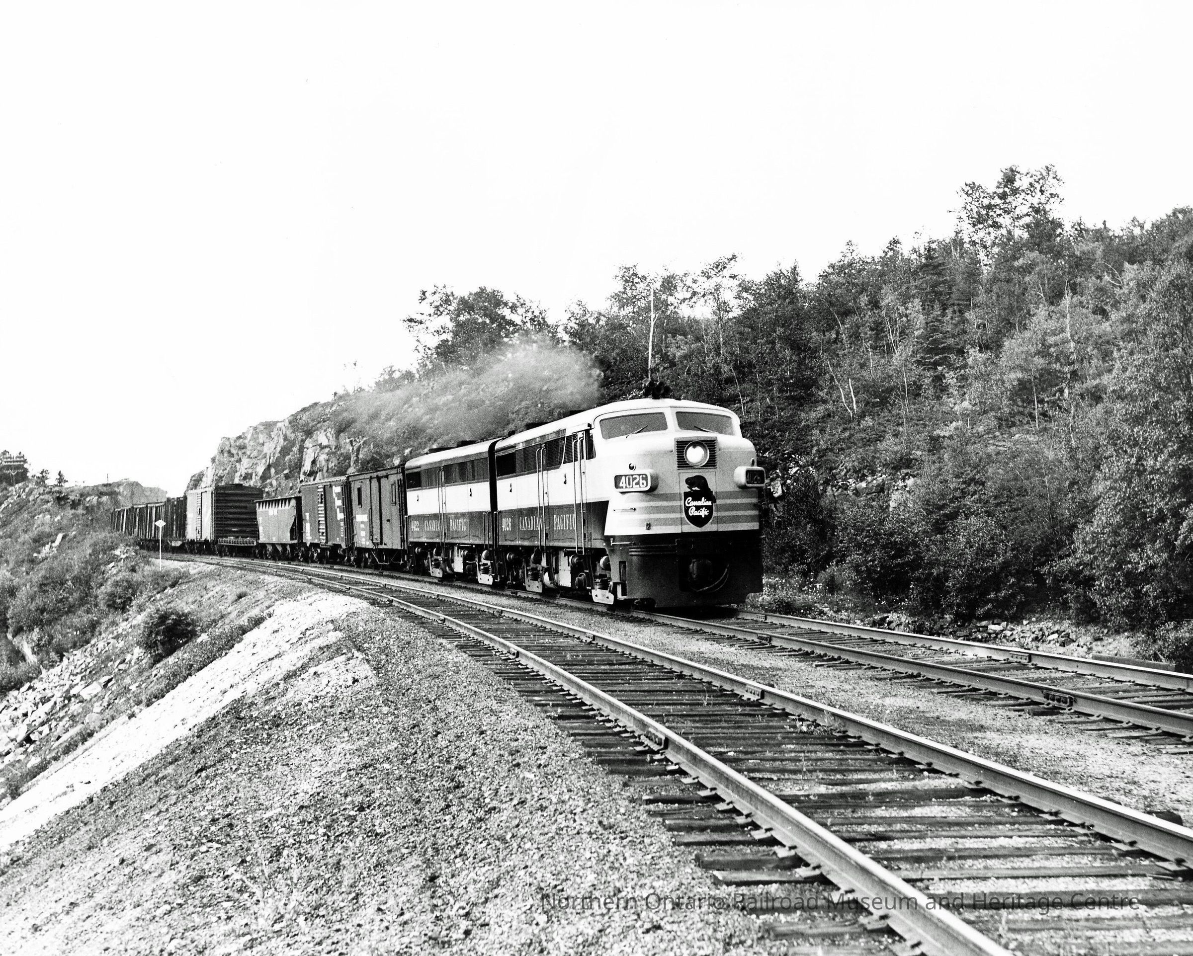 Black and White- Engine no. #4026, hauling freight containers, travels eastbound in Rossport, Ontario.Collection