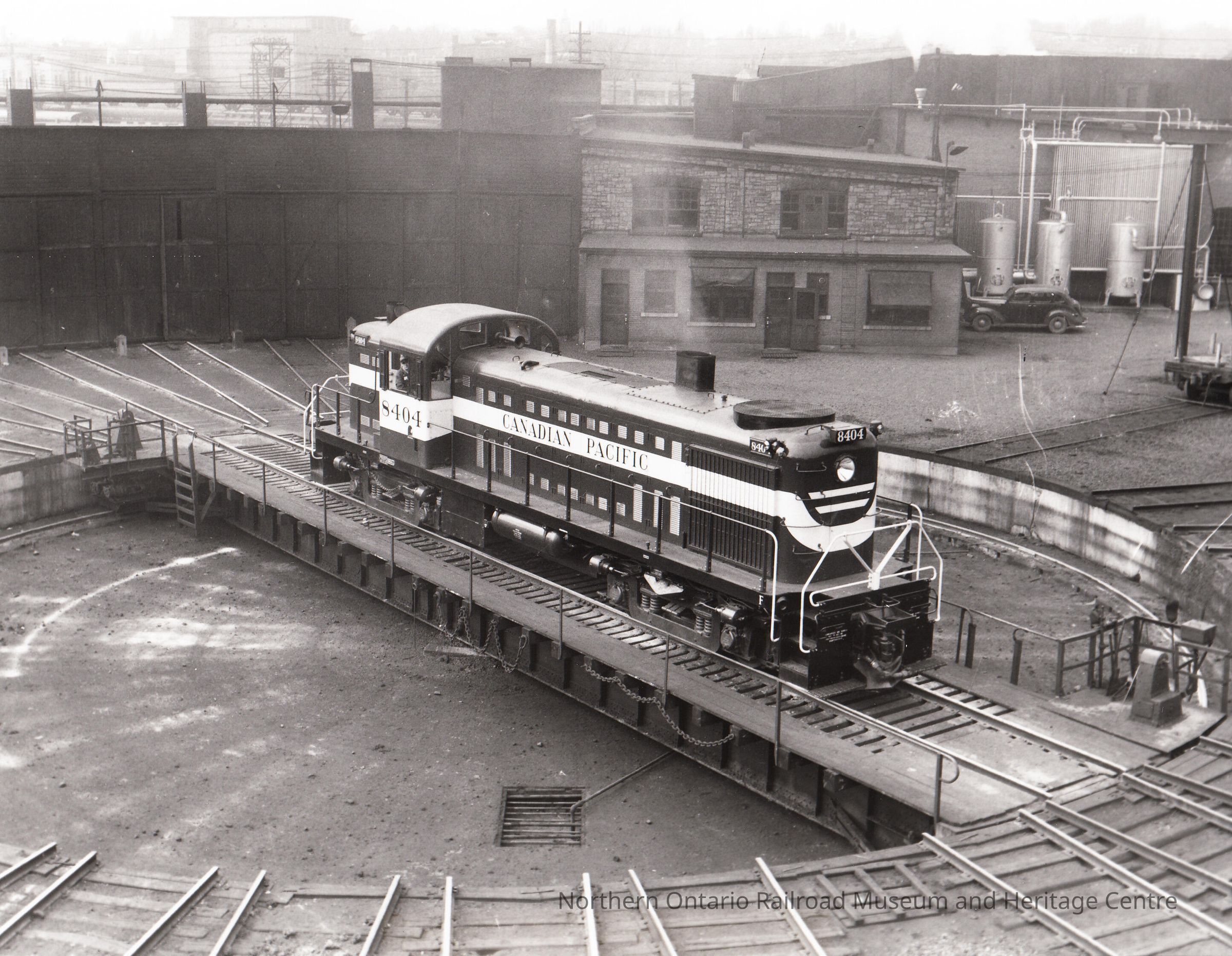 Black and White-CPR Engine no. 8404 is on a turntable in this image.Collection