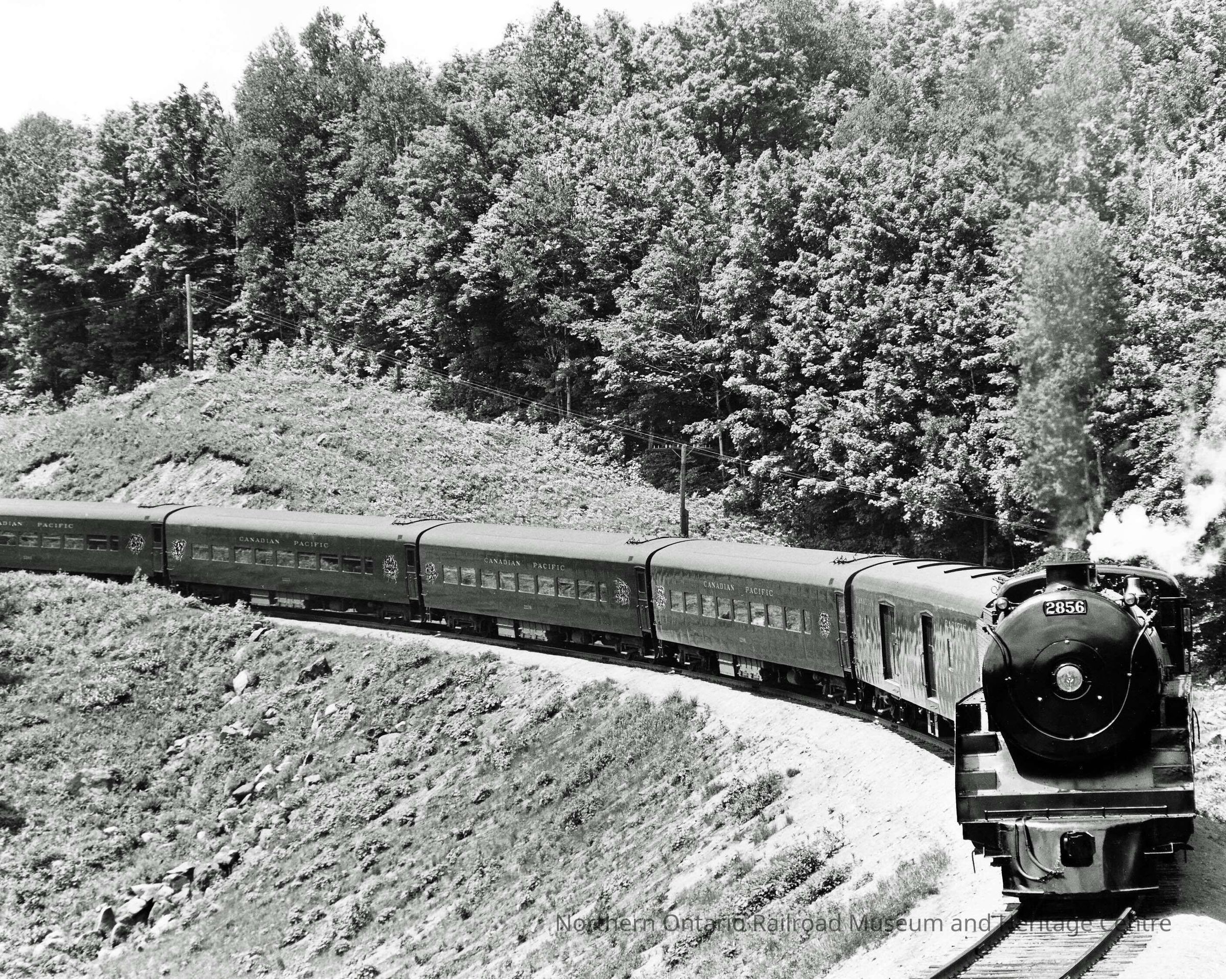 Black and White- Canadian Pacific Engine no. 2856, hauling passenger cars, rounds a bend built on an embankment.Collection