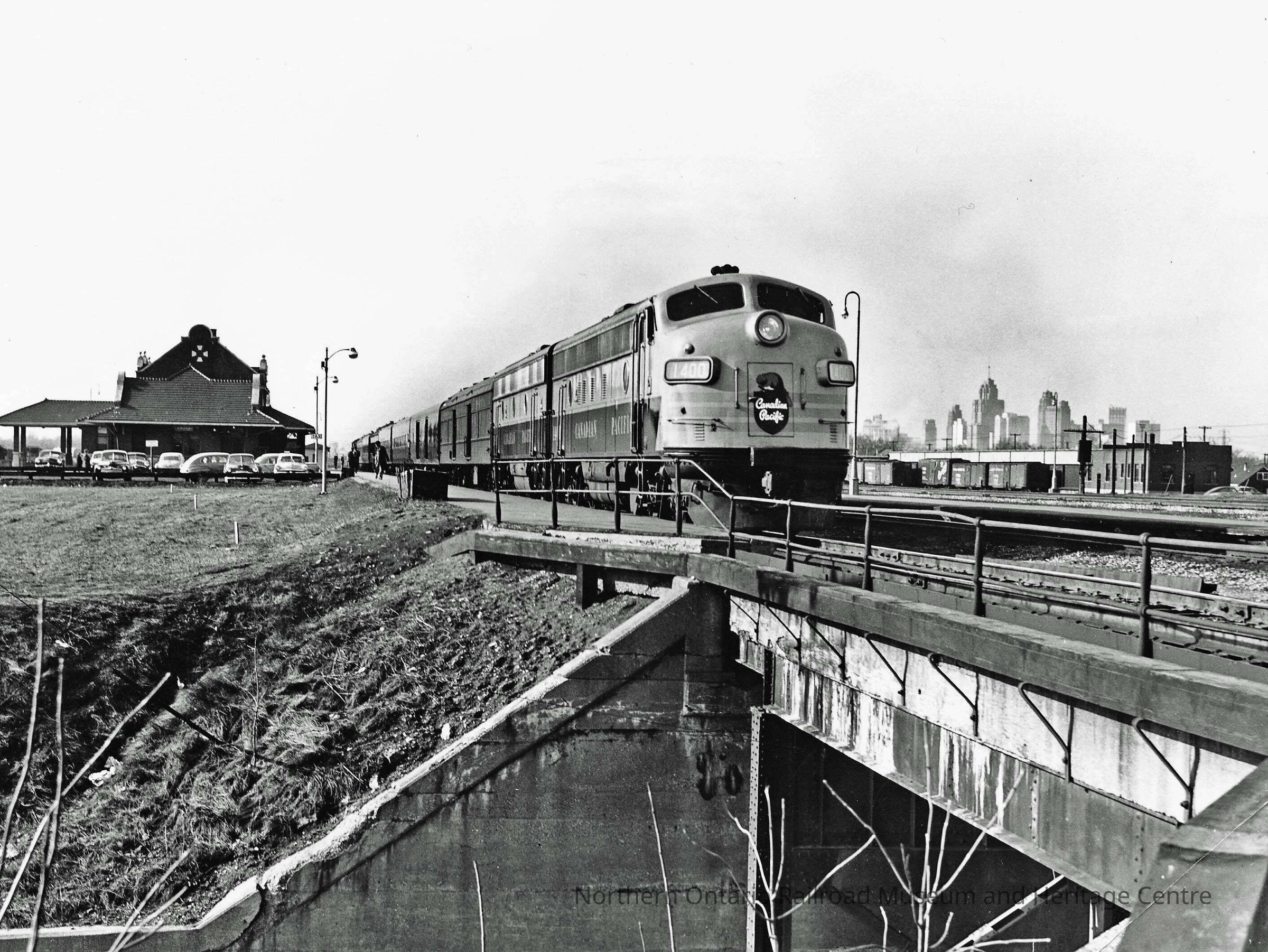 Black and White- CPR engine no. 22 leaving Windsor station. In the distance are the skyscrapers of Detroit.Collection
