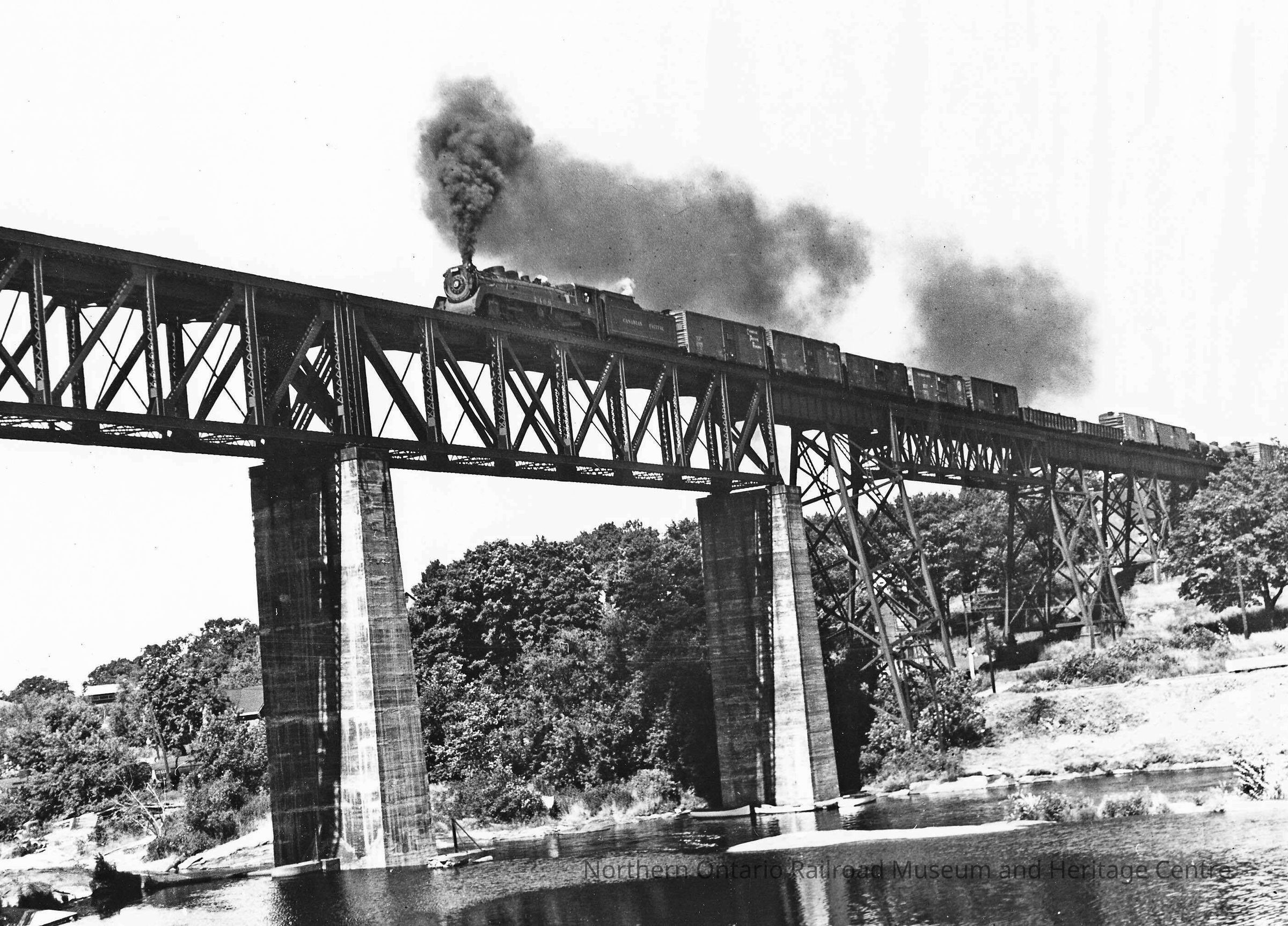 Black and White- A CPR freight train travels northbound over a railway bridge in Parry Sound, Ontario.Collection