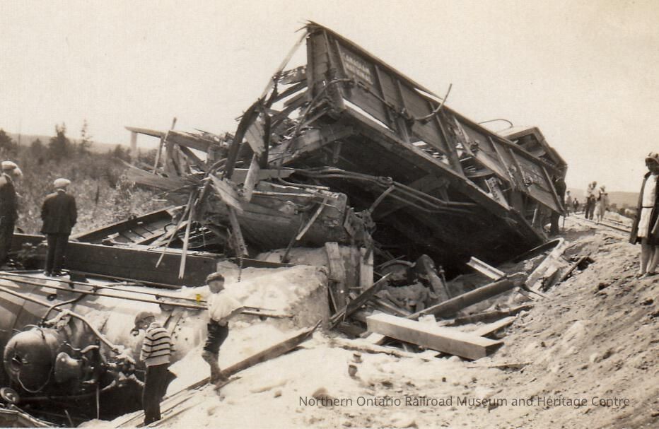 Black and white- A side view of a severely damaged derailed CN car, with several people inspecting it.Collection