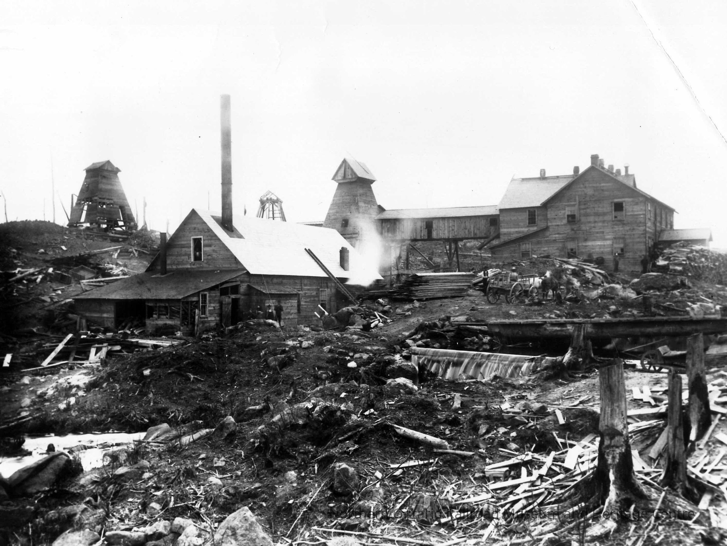 Black and white photograph of Dominion Nickel Mine, Sudbury, Ontario, Canada. Image Shows a smaller building in the middleground with two chimneys, and a larger building in the background. Timber is scattered across the ground, three tree stumps in the lower right corner.Collection