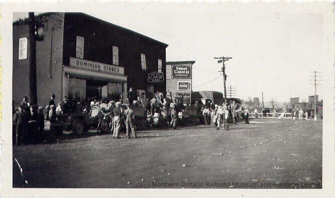 Digital copy of a black and white photograph of Capreol's Dominion store. A crowd is gathered outside the store.Collection
