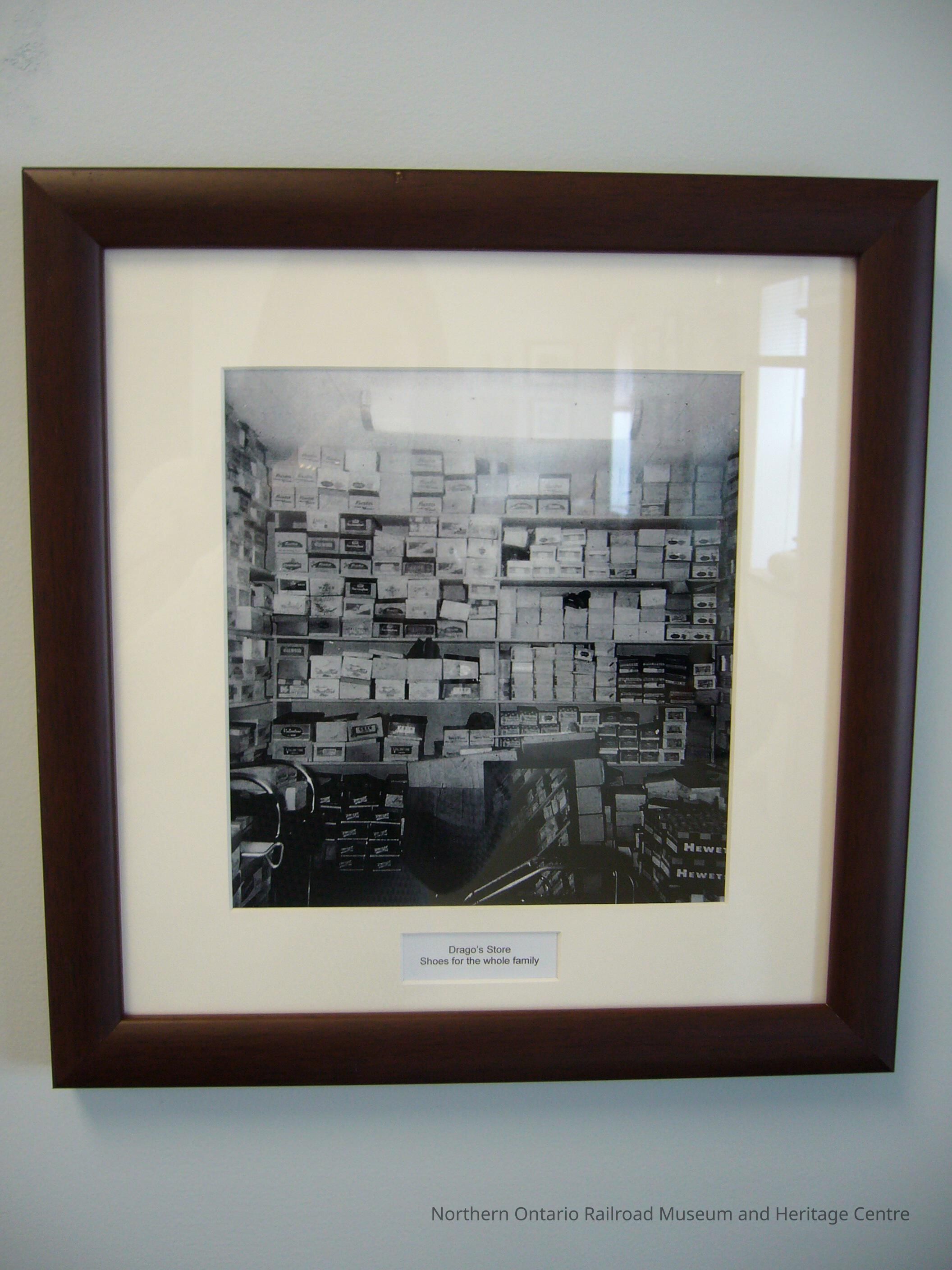 Enlarged reproduction of a black and white photograph of shoe boxes lining the walls in Drago's shoe store, Capreol, Ontario.