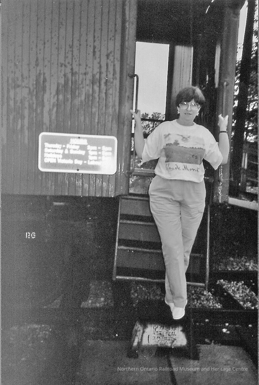 Digital reproduction of a black and white photograph of Elizabeth Hill (nee McKay) standing on the stairs of a school car (?) in Clinton, Ontario. She wears eyeglasses and a Claude Monet tshirt.