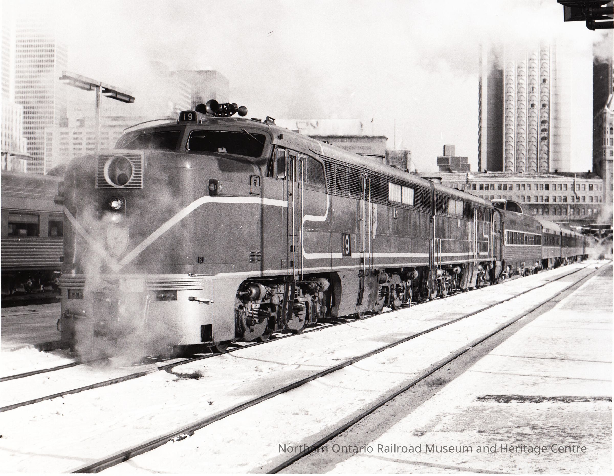 Black and White- Engine no. 19 sits in Windsor Station, attached to passenger cars.Collection