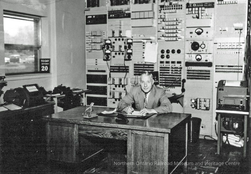 Photograph, F. Greaves in the Canadian National Railways telegraph office.Description