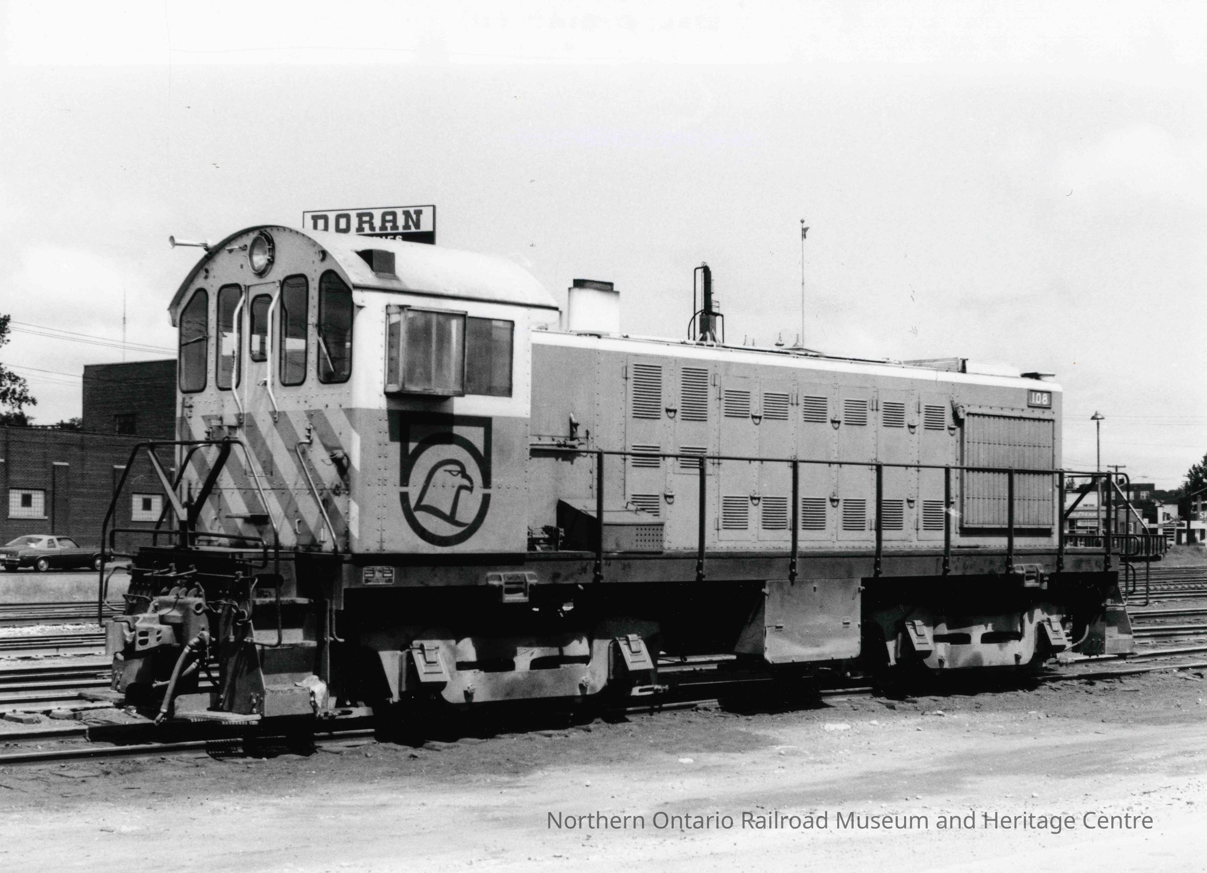 Photograph, Falconbridge Locomotive 108, circa 1976, near Doran buildings.Collection