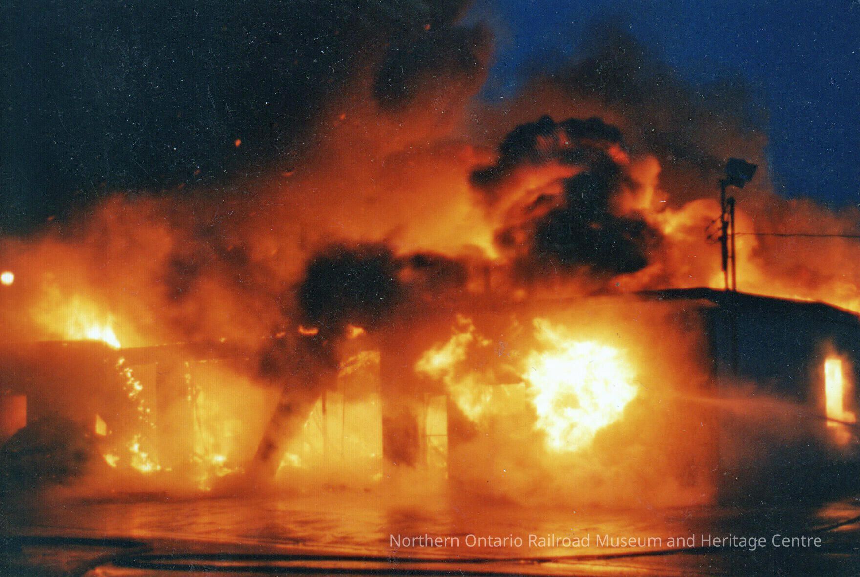 Large flames and plumes of smoke engulfing Mazzuca Motors in Capreol, October 17, 1993.
