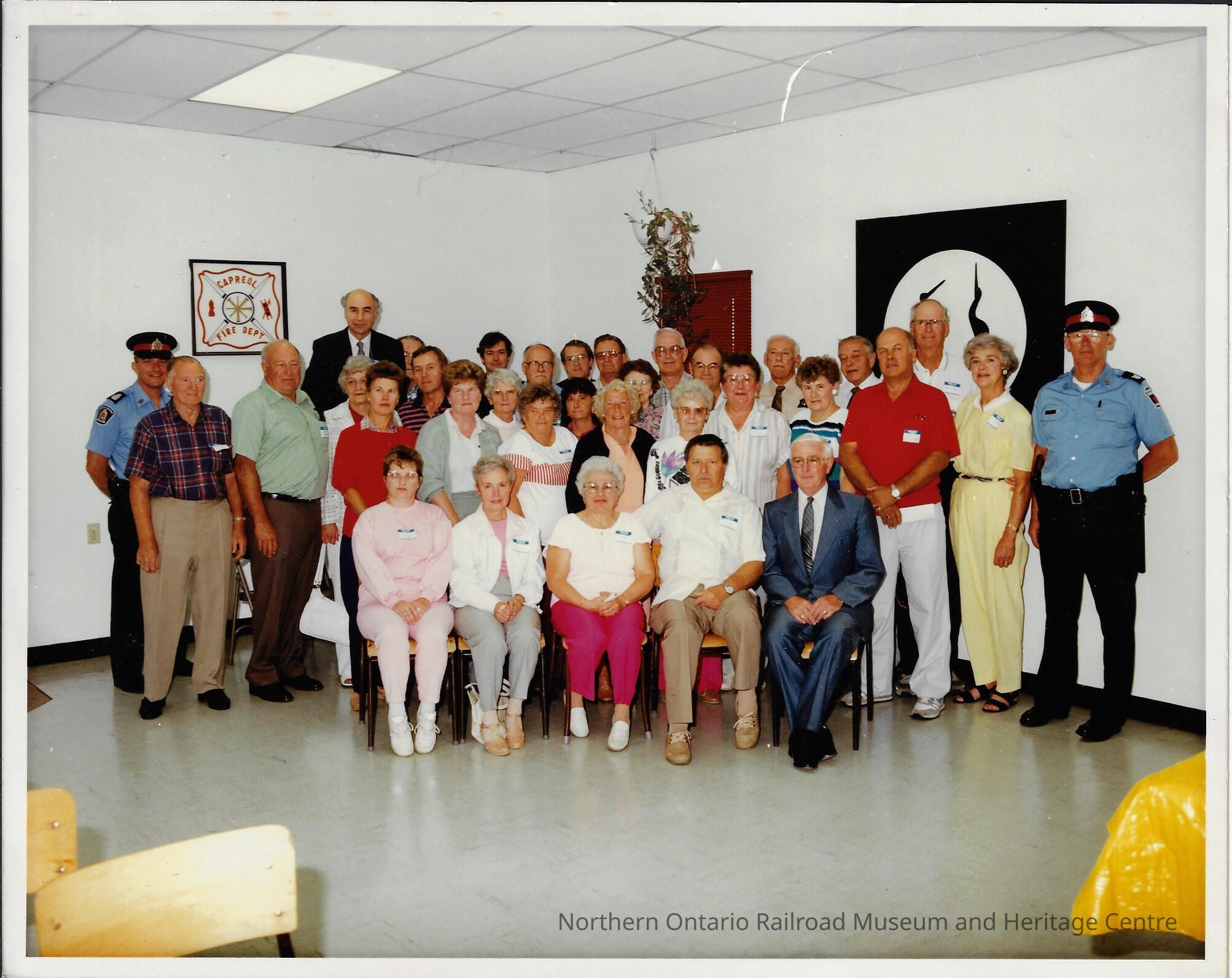 Photograph showing the volunteers of the first Sudbury Pilot Project for the Police Storefront in Capreol. The purpose of the storefront was to provide a program by which volunteers in the community were responsible for helping keep watch over the community. The volunteers would also check in on vulnerable members of the community and ensure they were safe and happy.
