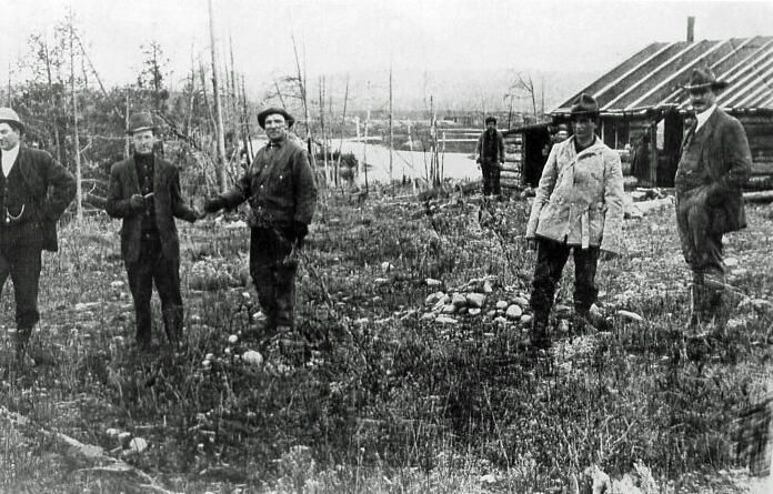 Digital reproduction of a black and white photograph of Cyril T. Young, Otto Redfern, Frank J. Dennie, George Ranger Jr., John O'Hara, and Walter Stull standing in the brush outside a log cabin.Collection