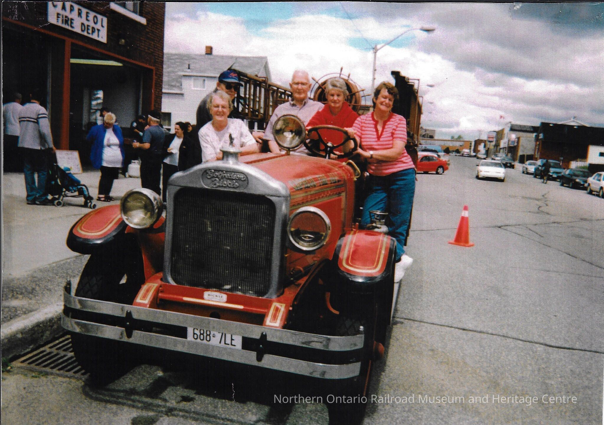 Photograph: Five people posing with the 1923 Bickle outside of the Capreol FirehallEntry/Object ID