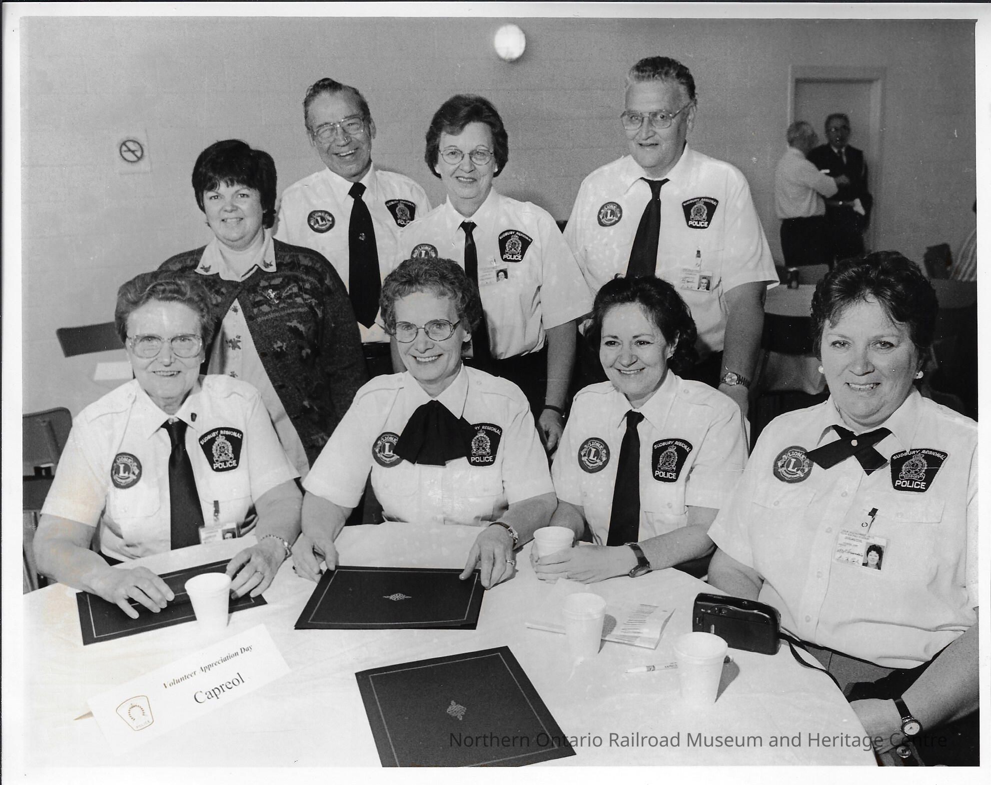 Black and white photograph showing 6 women and two men, all wearing white button down shirts, black ties, and name badges. They each have two patches on their shirts, one reads "Sudbury Regional Police," the other reads "Lion's Club," four of the six women are seated, the other two women and two men are standing behind the seated women. They are at what appears to be a luncheon for the Sudbury Regional Police's Volunteer Appreciation Day. It is assumed that all the people in the photo were volunteers for the Police Storefront in Capreol.