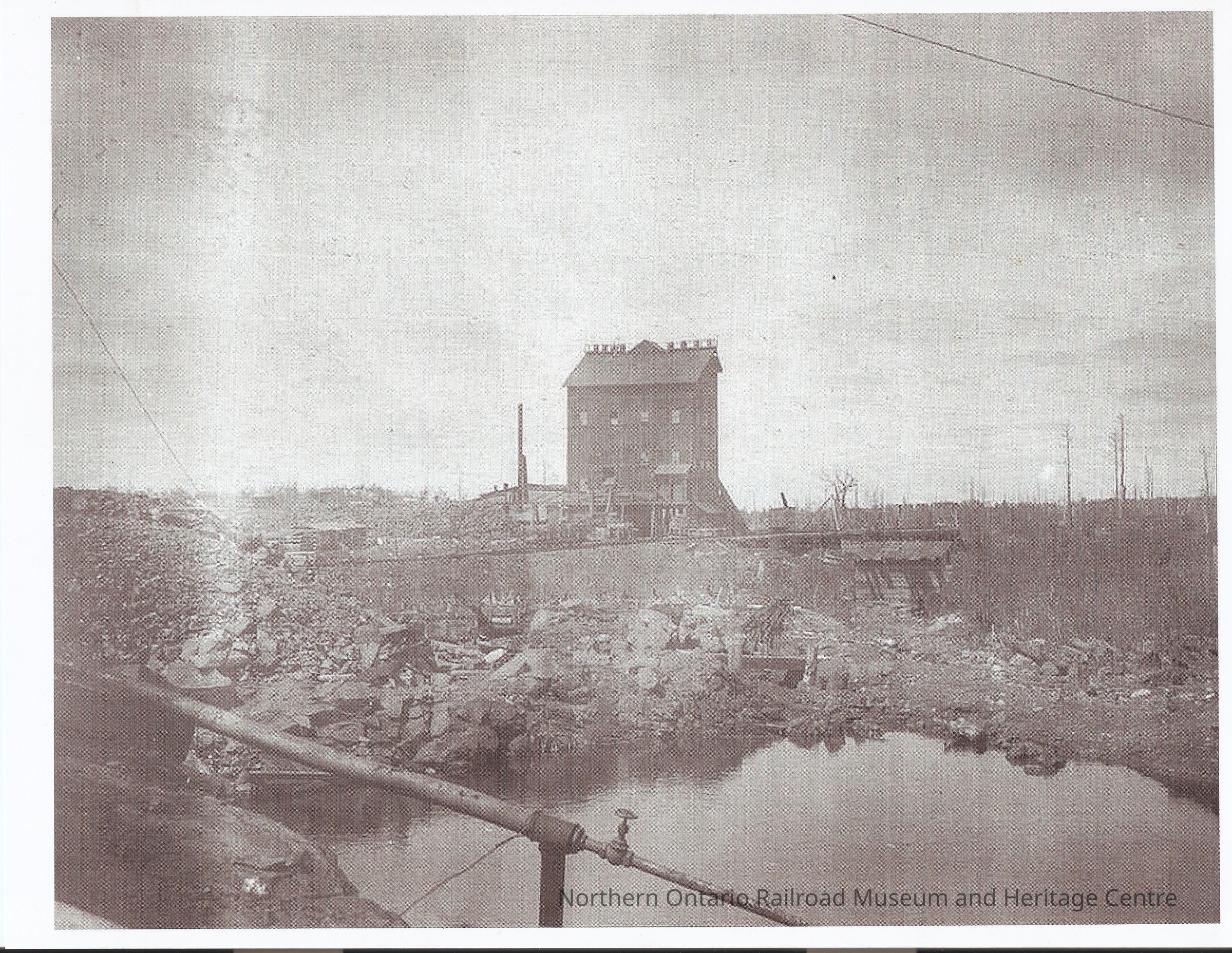Good quality photocopy of an original photograph of the head frame at Gertrude Mine. Building is in the center of the photograph. A small pond is in the foreground.