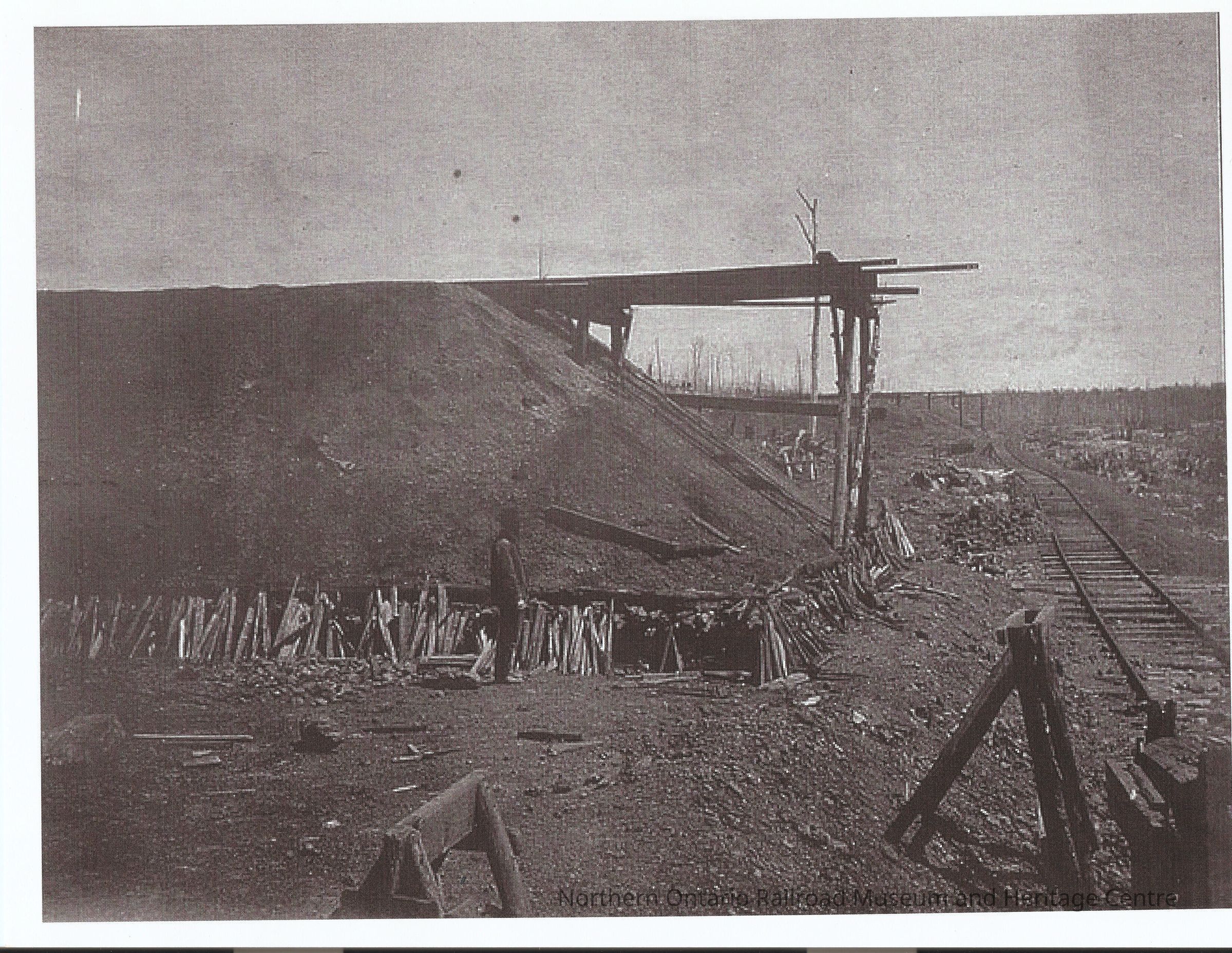 Good quality photocopy of an original photograph of a Gertrude Mine roast heap to the left of the image with a man standing beside it. Railroad tracks cross the image vertically on the right.