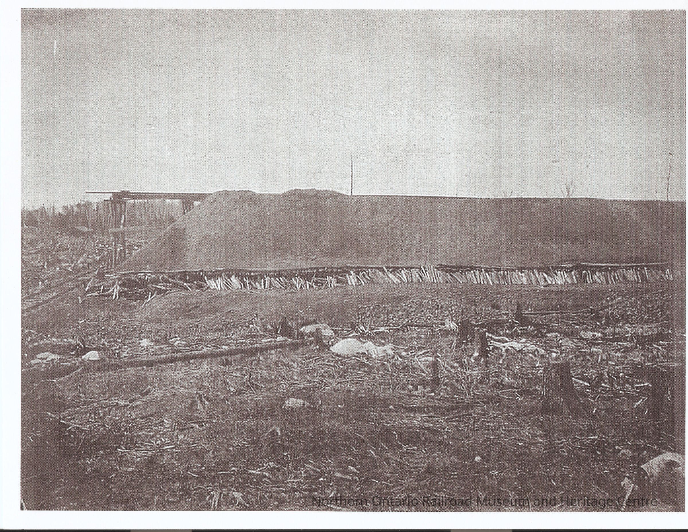 Good quality photocopy of an original photograph of a Gertrude Mine roast heap to the right of the image. Tree stumps and tinder in foreground. Railroad tracks cross the image vertically on the left.