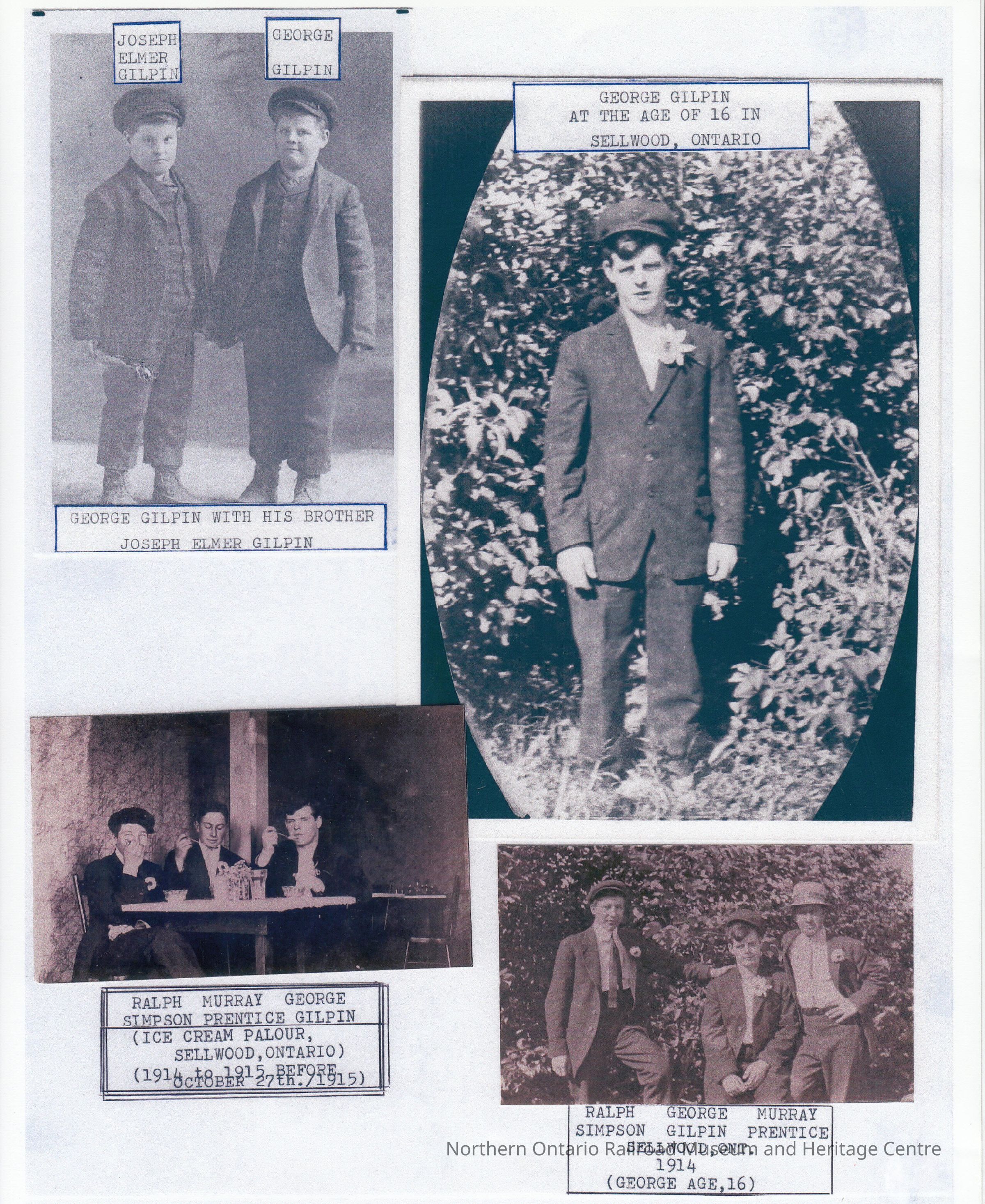 Black and White- A group of four photographs depicting Joseph Elmer Gilpin, George Gilpin, then another photograph of George Gilpin at age 16, then a photograph of Ralph Simpson, Murray Prentice, and George Gilpin eating, and a photograph of Ralph Simpson, George Gilpin, and Murray Prentice in Sellwood Ontario 1914 at age 16.Collection