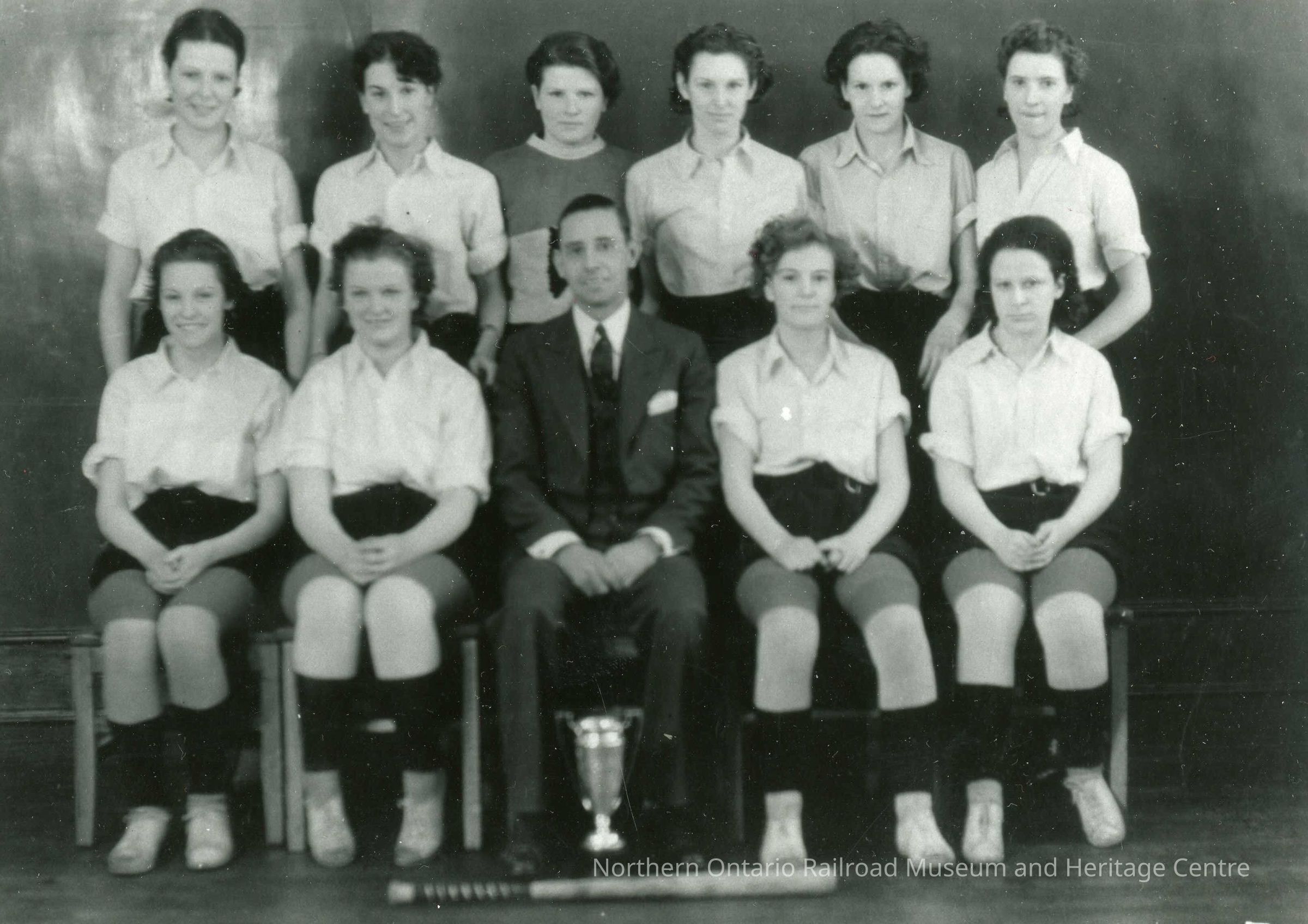 Photograph, Girls baseball team, Capreol, Ontario. Girls Softball Team, M. Wychara, M. Garrity, R. Garrity, M. Deavy, E. Studer, Marion Deavy, F. Lajambe, D. Studer, Mr. Wallace, E. Nepitt, M. McLean.Collection