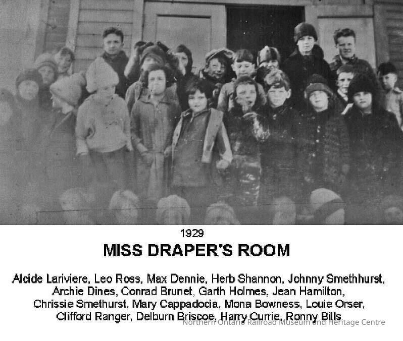 Digital copy of a black and white photograph of a group photograph of the children in Miss Draper's room, most likely from Norman Public School, 1929. Photo includes Alcide Lariviere, Leo Ross, Max Dennie, Herb Shannon, Johnny Smethhurst, Archie Dines, Conrad Brunet, Garth Holmes, Jean Hamilton, Chrissie Smethurst, Mary Cappadocia, Mona Bowness, Louie Orser, Clifford Ranger, Delburn Briscoe, Harry Currie, Ronny Bills.Context
