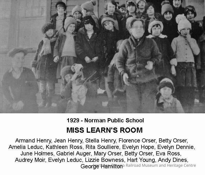 Digital copy of a black and white photograph of a group photograph of the children in Miss Learn's room from Norman Public School, 1929. Photo includes Armand Henry, Jean Henry, Stella Henry, Florence Orser, Betty Orser, Amelia Leduc, Kathleen Ross, Rita Soulliere, Evelyn Hope, Evelyn Dennie, June Holmes, Gabriel Auger, Mary Orser, Betty Orser, Eva Ross, Audrey Moir, Evelyn Leduc, Lizzie Bowness, Hart Young, Andy Dines, George Hamilton.Context