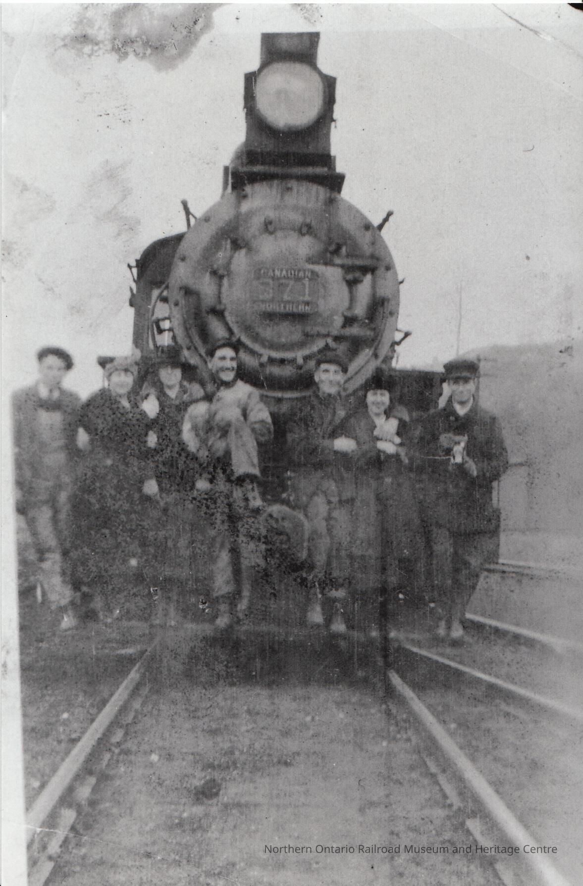 Photograph - Group posing on Canadian Northern steam locomotive no. 371Description