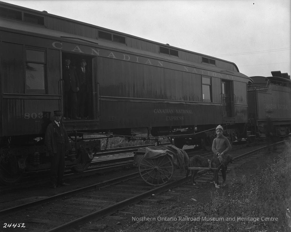 Photograph, Handling mail with dog team to Canadian National Railways Express Mail car.Collection