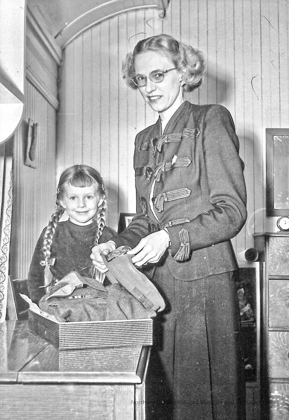 Digital reproduction of a black and white photograph of Helen McKay with her daughter, Elizabeth. Helen stands to the right opening a box of clothing (?). Elizabeth stands behind the table to the left with her hair in two braids.