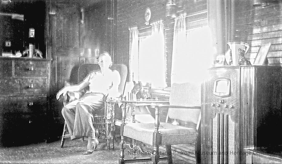Digital reproduction of a black and white photograph of school car teacher Helen McKay seated on an arm chair in her living quarters on the train, 1937.