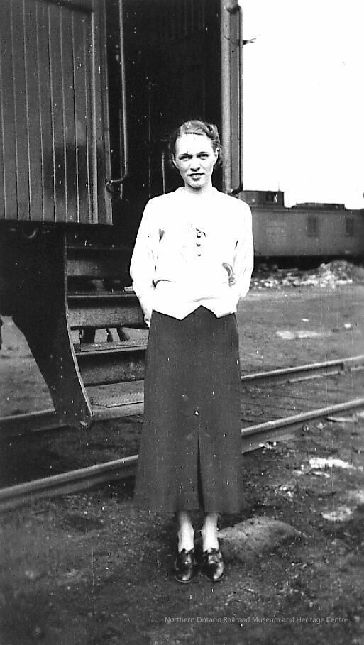 Digital reproduction of a black and white photograph of Helen McKay standing outside a rail car (probably school car) at Sioux Lookout, Easter 1936.