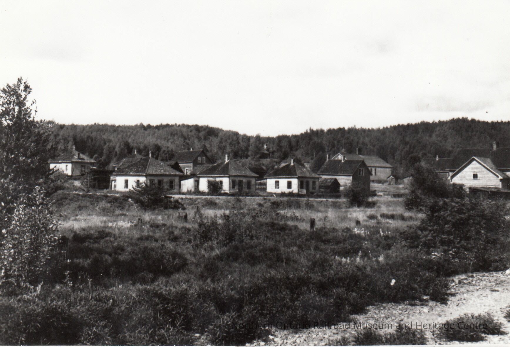 Black and White- A small neighborhood of houses stand abandoned. The nearby forest encroaches upon where they stand. There are eleven buildings in this photograph.Collection