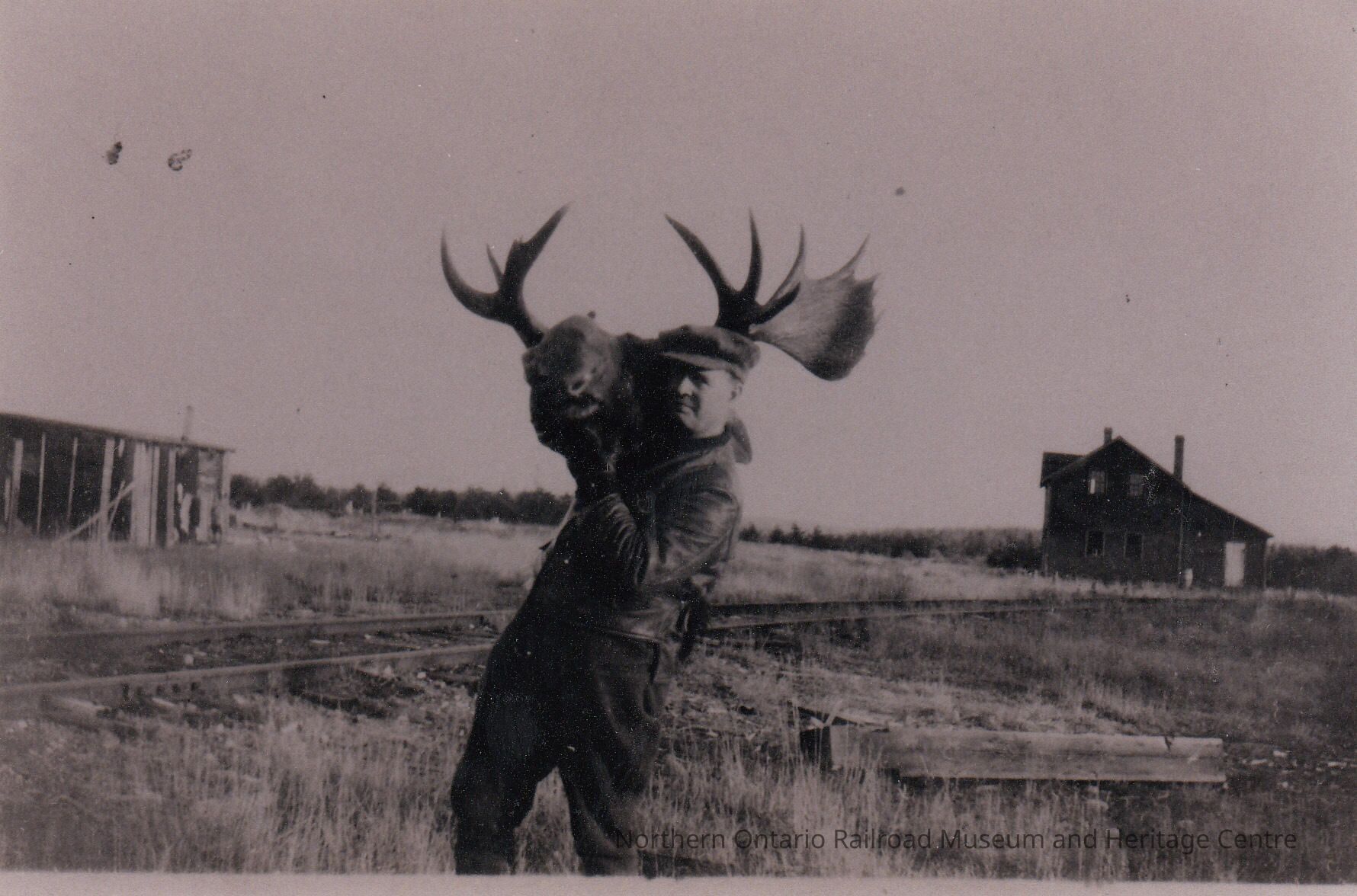 Black and White- A hunter wearing a cap poses for a photograph holding a massive moose head. In the background is a Sellwood house.Collection