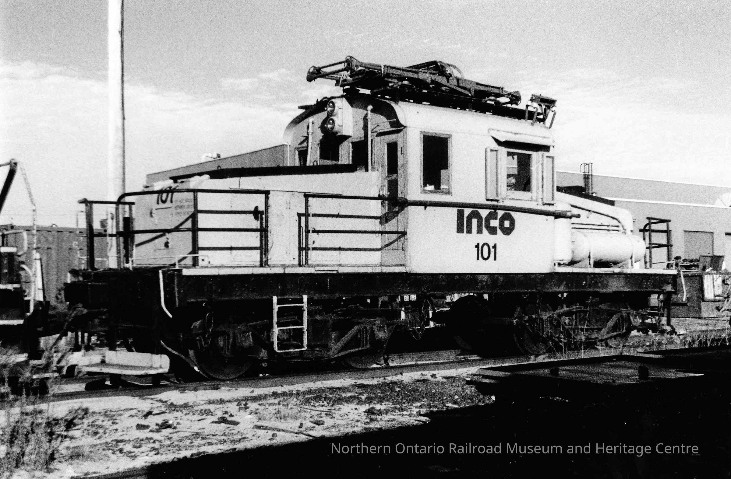 Black and White- INCO Engine no. 101 sits outside of a warehouse.Collection