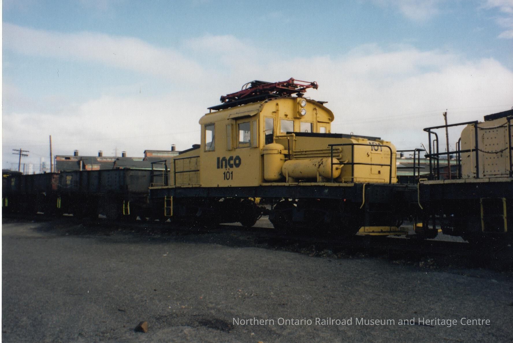 Colour- A photograph depicting INCO Alco S-2 engine no. 101, painted yellow, sitting in a rail yard attached to other cars.Collection