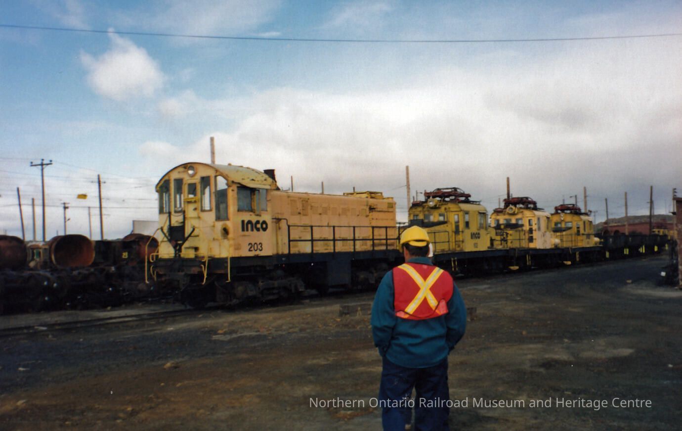 Colour- A worker wearing an orange vest and yellow hardhat inspects INCO Alco S-2 engine no. 203, which is attached to engine no. 102, and two others, in a rail yard. It was built in 1946 for Western Maryland #144. It was also, before being bought by INCO, owned by CIL, and also numbered 144.Collection