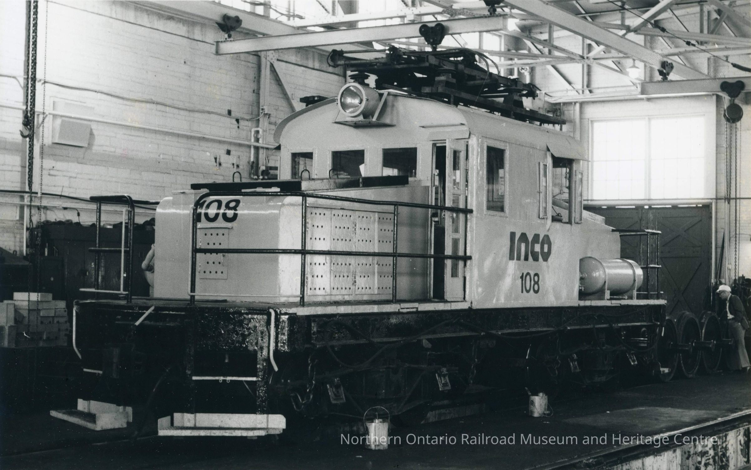 Photograph, INCO Electric 108 in Loco Shop, Copper Cliff, Ontario, May 17, 1975, Photo by Gordon Jomini.Collection