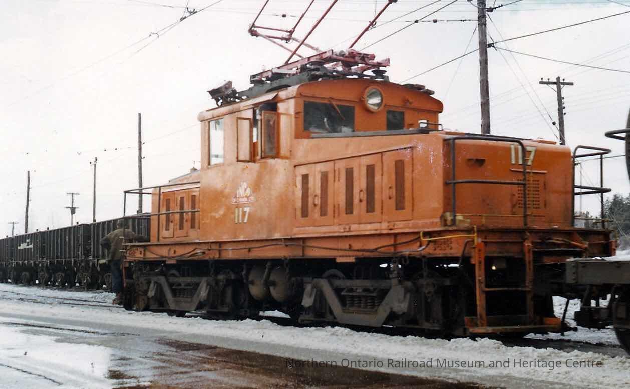 Colour photograph of orange INCO electric locomotive no. 117.Collection