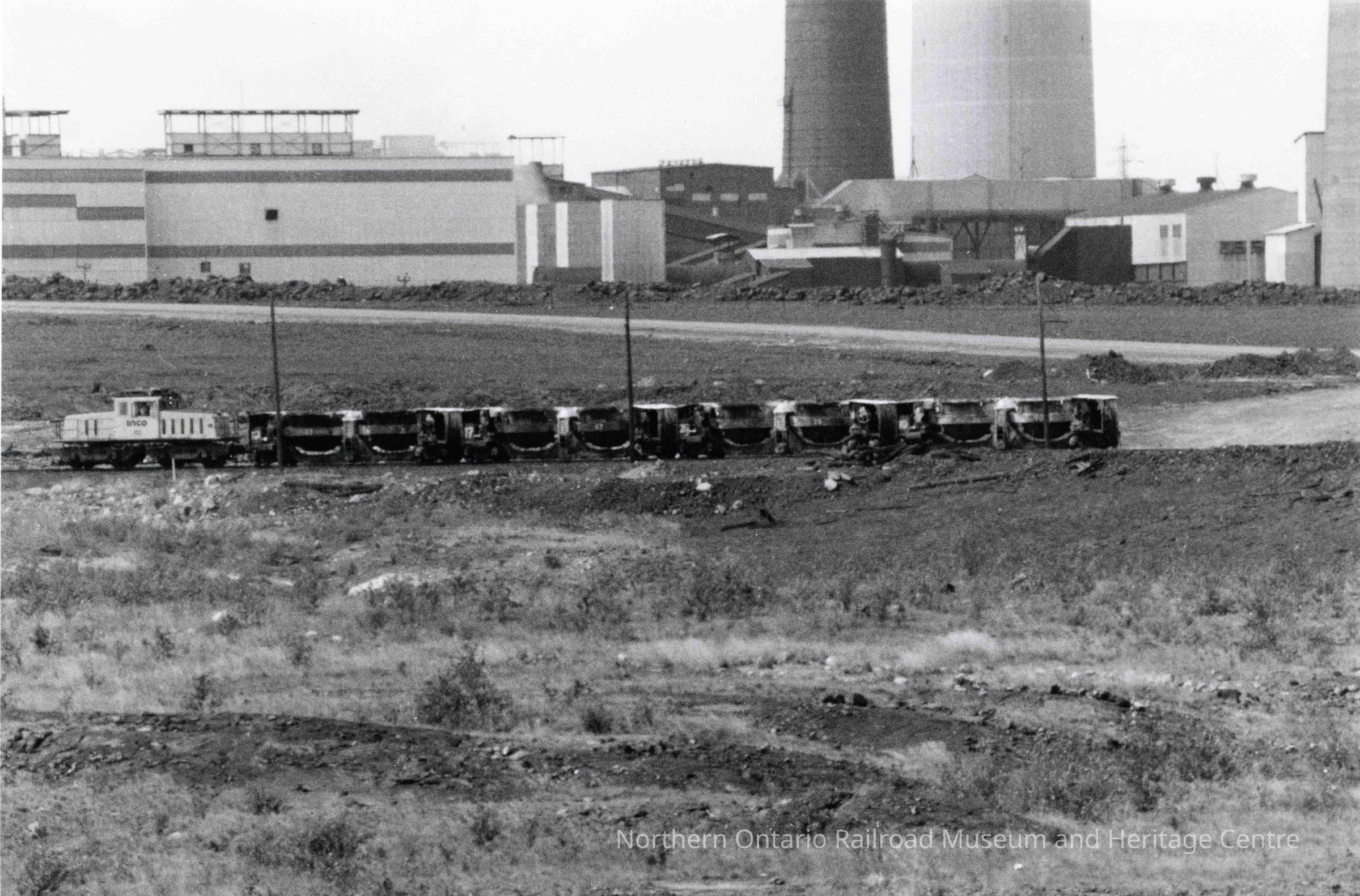 Photograph, INCO Locomotive with slag pots, Photo by Dale Wilson, Darkroom wirk by Gordon Jomini.Collection