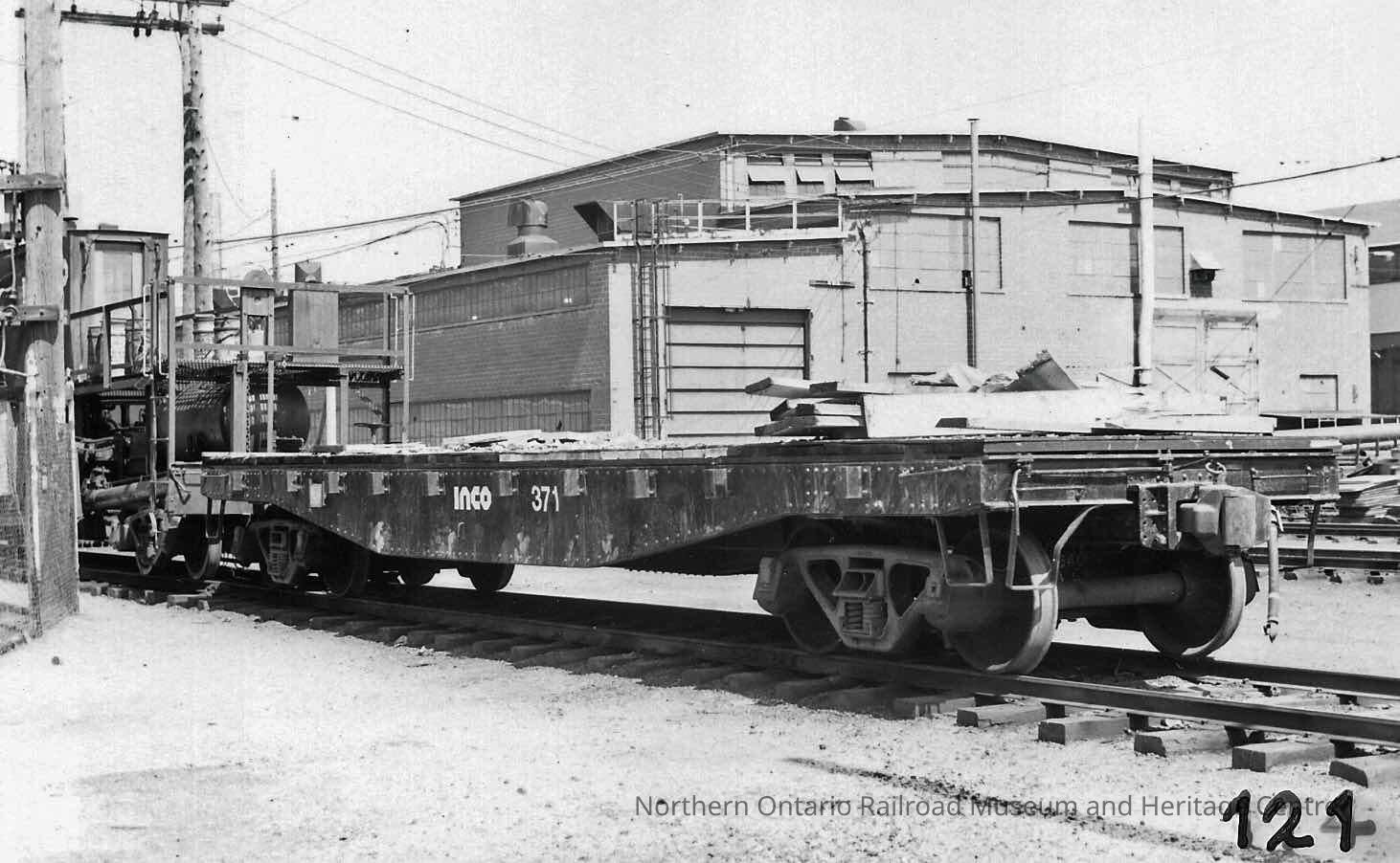 Black and white photograph of INCO railroad car no. 371 outside large white building (garage?).Collection
