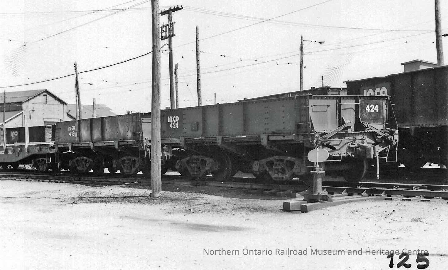 Black and white photograph of INCO railroad cars 424 and 418 in the railroad yard.Collection