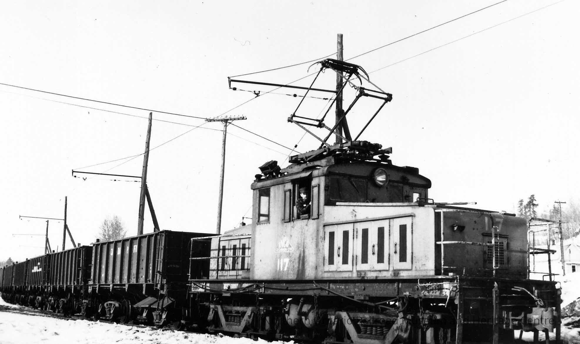 Black and white photograph of an INCO train with electric locomotive 117. Conductor in window.Collection